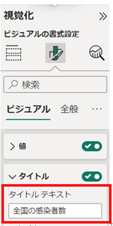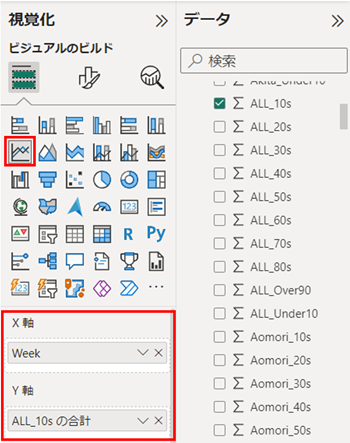 ⑥ 「視覚化」から使用するビジュアルを選択し、可視化したいデータを選択します。