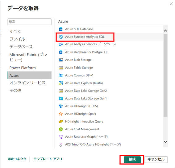 ② 「Azure Synapse Analytics SQL」を選択し、「接続」を選択します。