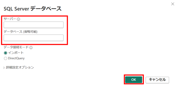 ③ サーバー名とデータベース名を入力し、「OK」を選択します。