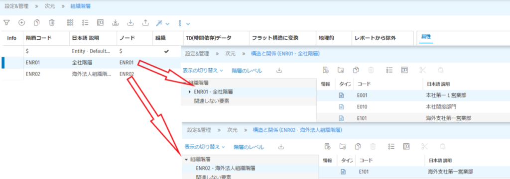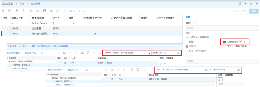 組織とカスタム次元では、シナリオとピリオドの組み合わせによって、同一ノードの下で要素を変更することができます。