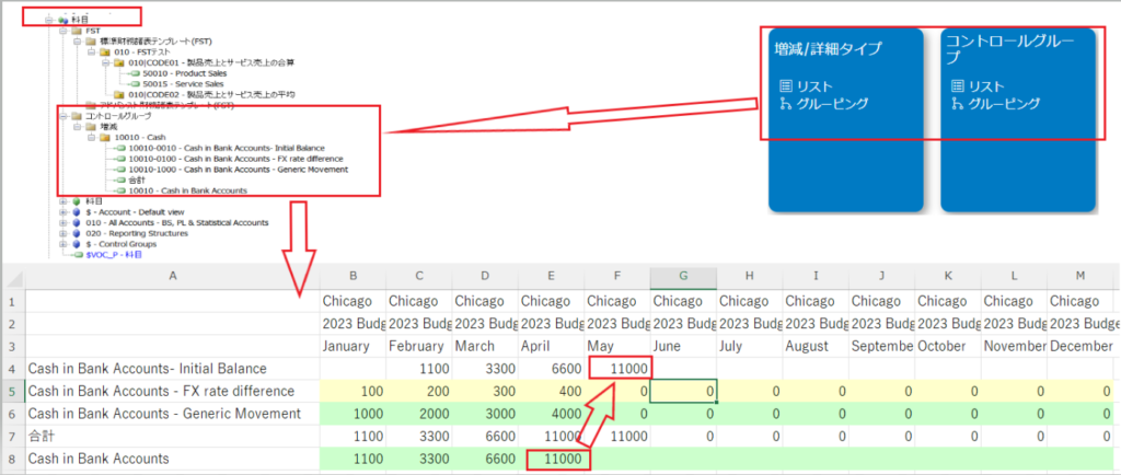 さらに増減/詳細タイプをコントロールグループでノーマル科目と増減/詳細科目にマッピングすることで、同一ノードと増減/詳細タイプで増減/詳細科目にデータが入力できます。