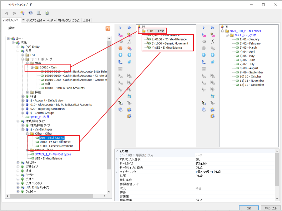 上の表が科目次元のコントロールグループのノードと増減/詳細タイプの要素を組みわせた表です。