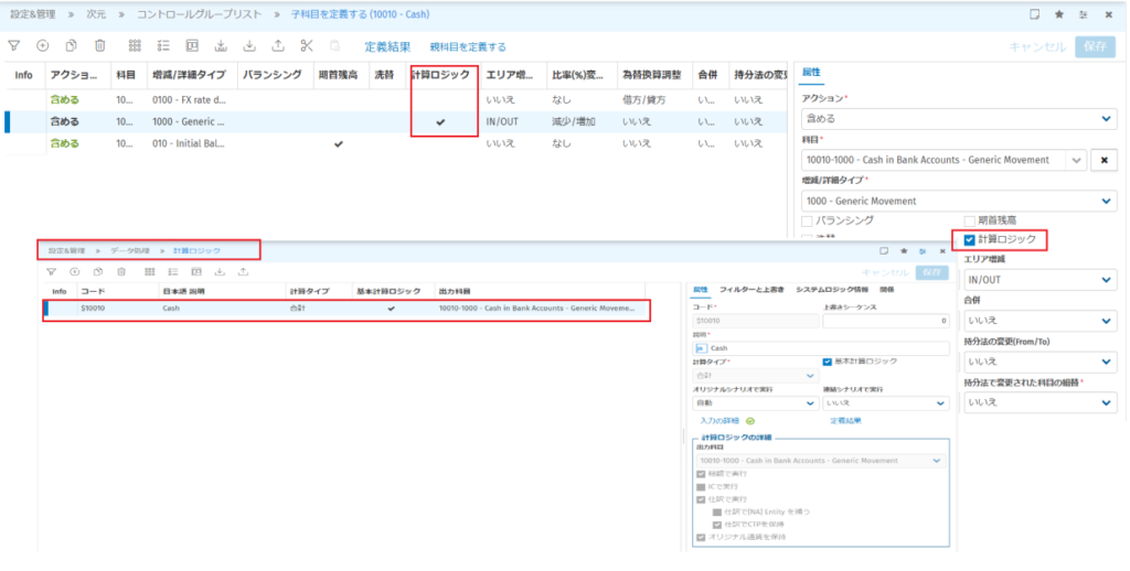 コントロールグループのリストの設定で「計算ロジック」をチェックすると、純損益科目や増減/詳細科目などの計算で使用する「計算ロジック」が自動作成されます。