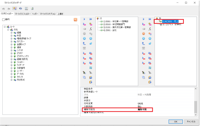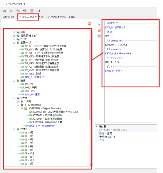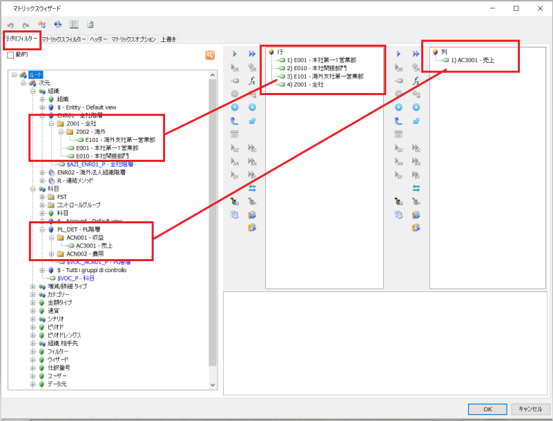 行/列フィルターでマトリックスに表示するものを選択します。