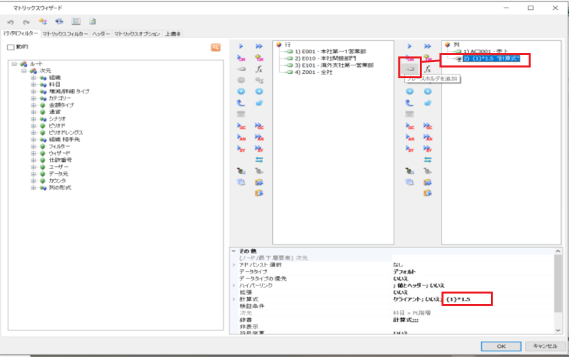 2列目にプレースホルダーを追加し、計算式のプロパティには {1}×1.5 という式({1} は1列目を意味します)を設定します。