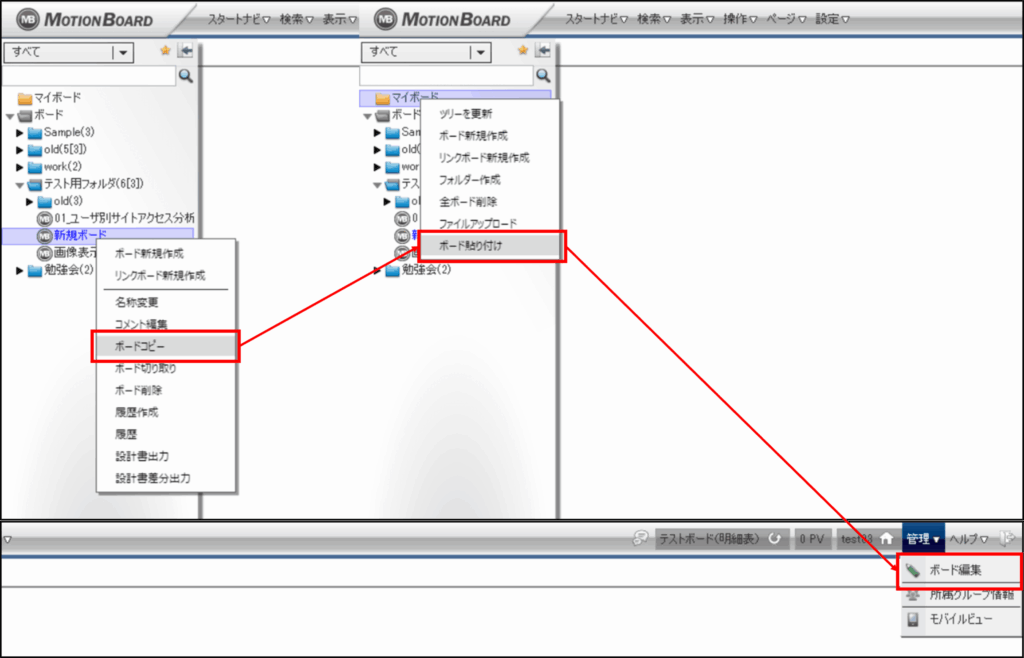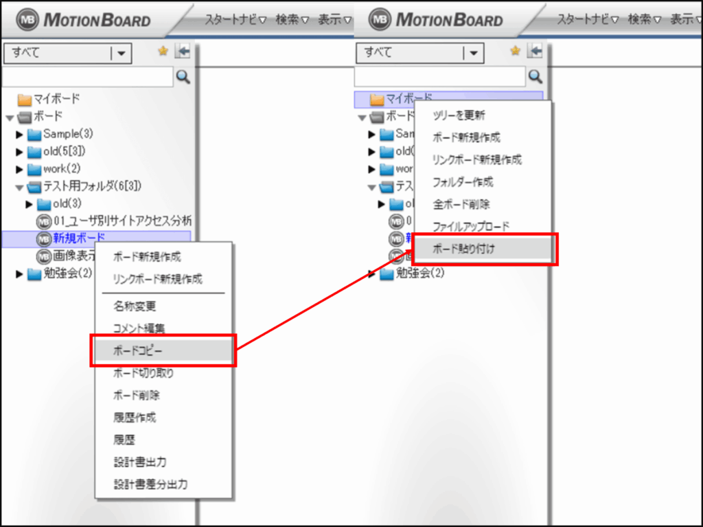 ボードツリー上で右クリックすることで、ボードのコピーや貼り付けを行うことができます。