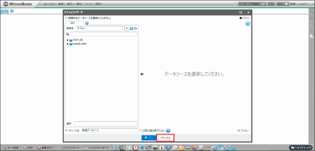 アイテムウィザードでデータソースを選択する画面が出ますが、今回は「キャンセル」で閉じます。