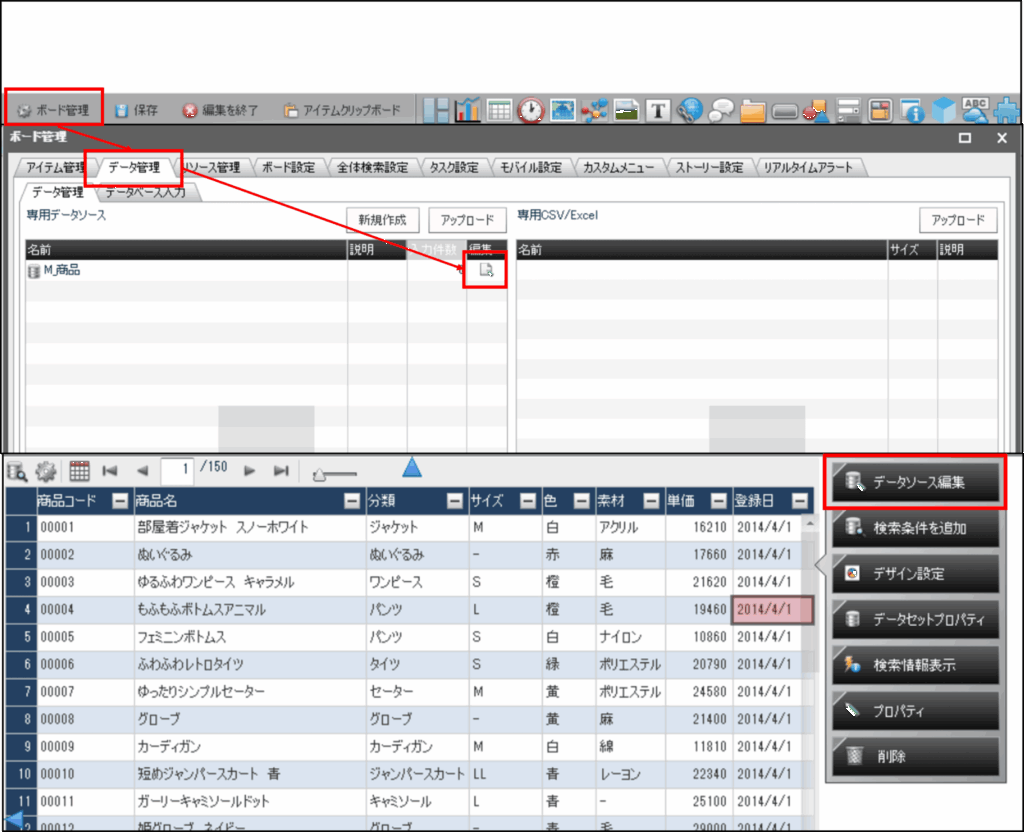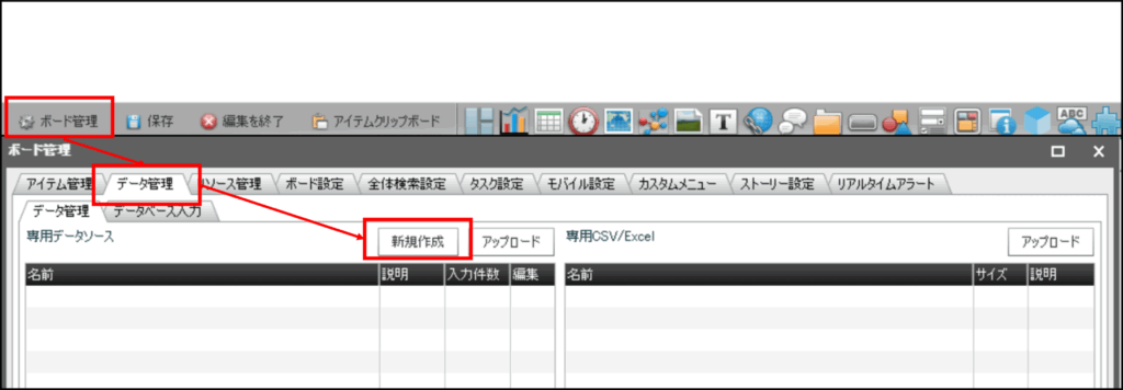画面下部の「ボード管理」をクリックし、ボード管理画面から「データ管理」タブを選択します。