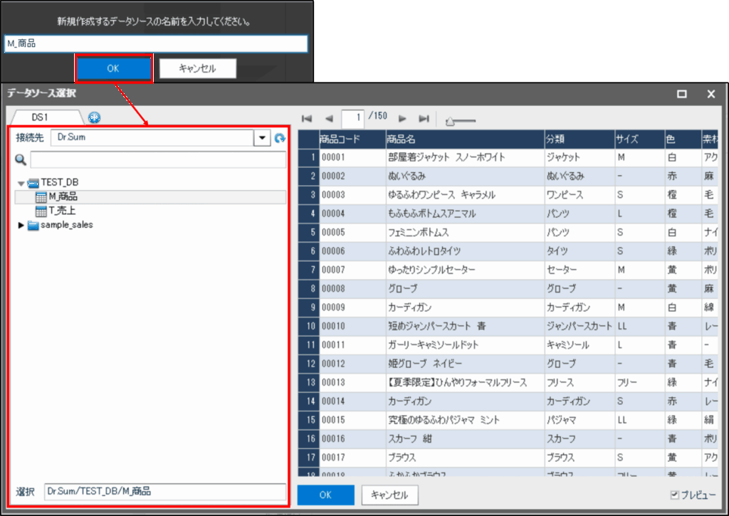 名前を入力し、先ほど作ったデータソースを選択してから「OK」をクリックします。