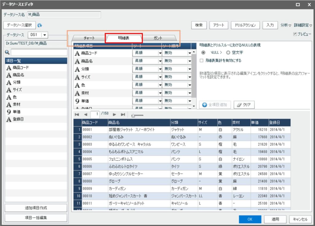 今回は明細表を作成するので、チャートのタブが表示されている場合は明細表のタブに切り替えます。