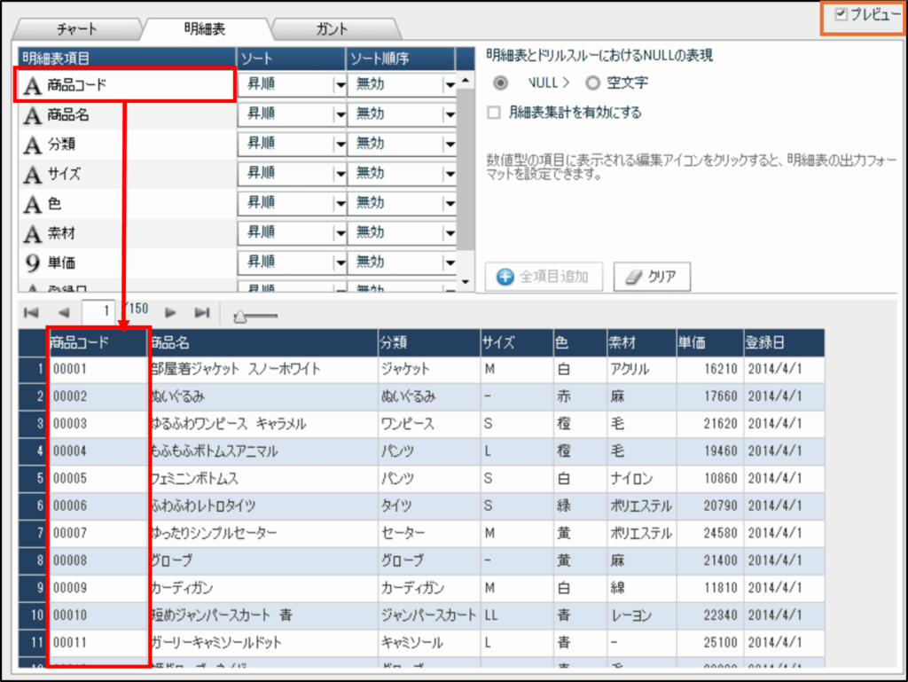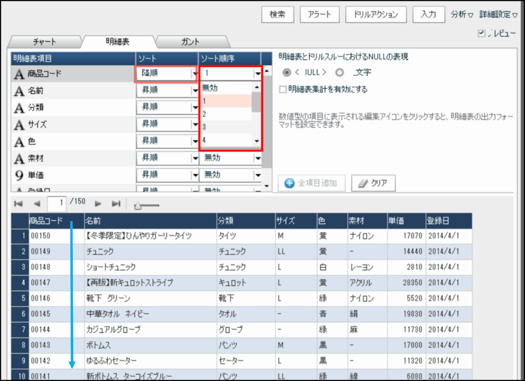 ソート順序は、明細表項目の右側にあるソート・ソート順序から変更できます。