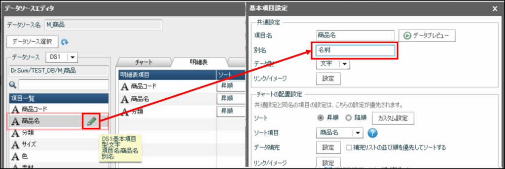 項目の名称を変えたい場合は、左の項目一覧で変えたい項目の上にカーソルを置くと鉛筆マークが出るので、クリックして基本項目設定の画面を開きます。