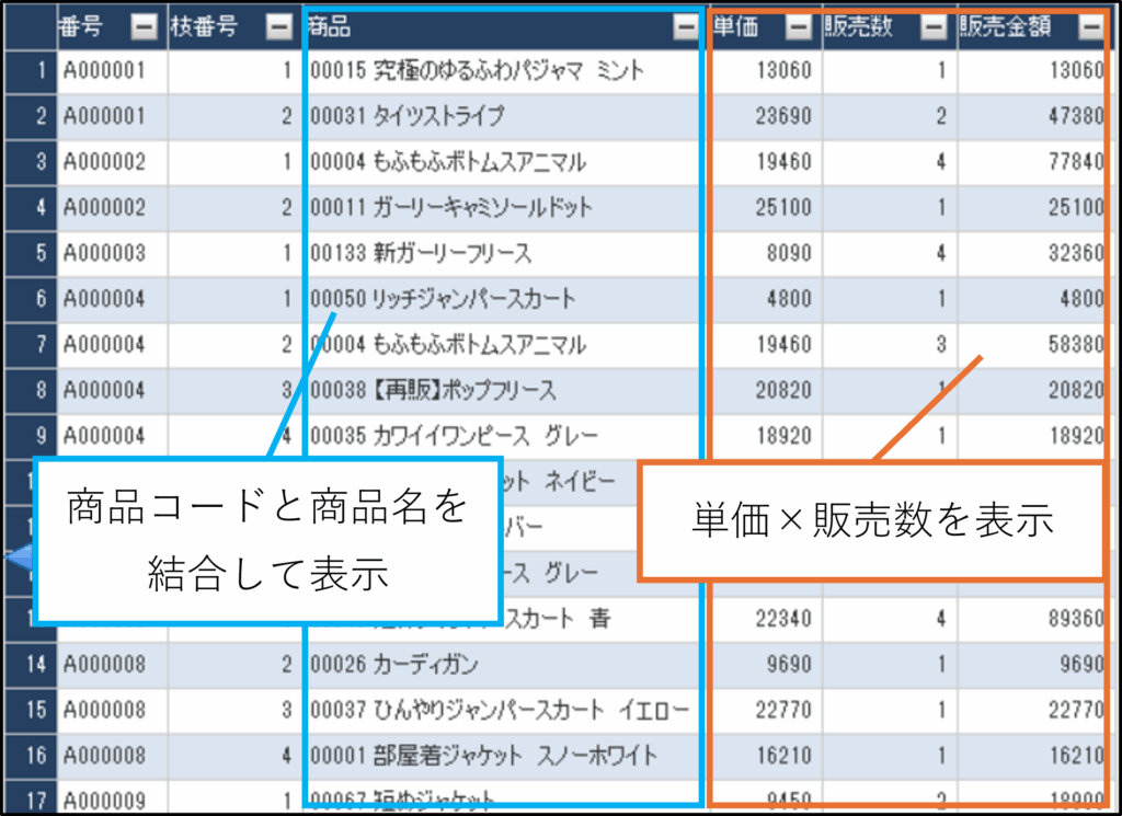 まずは、「商品コード」と「商品名」の間に半角スペースを入れて結合した「商品」という項目を作ってみます。