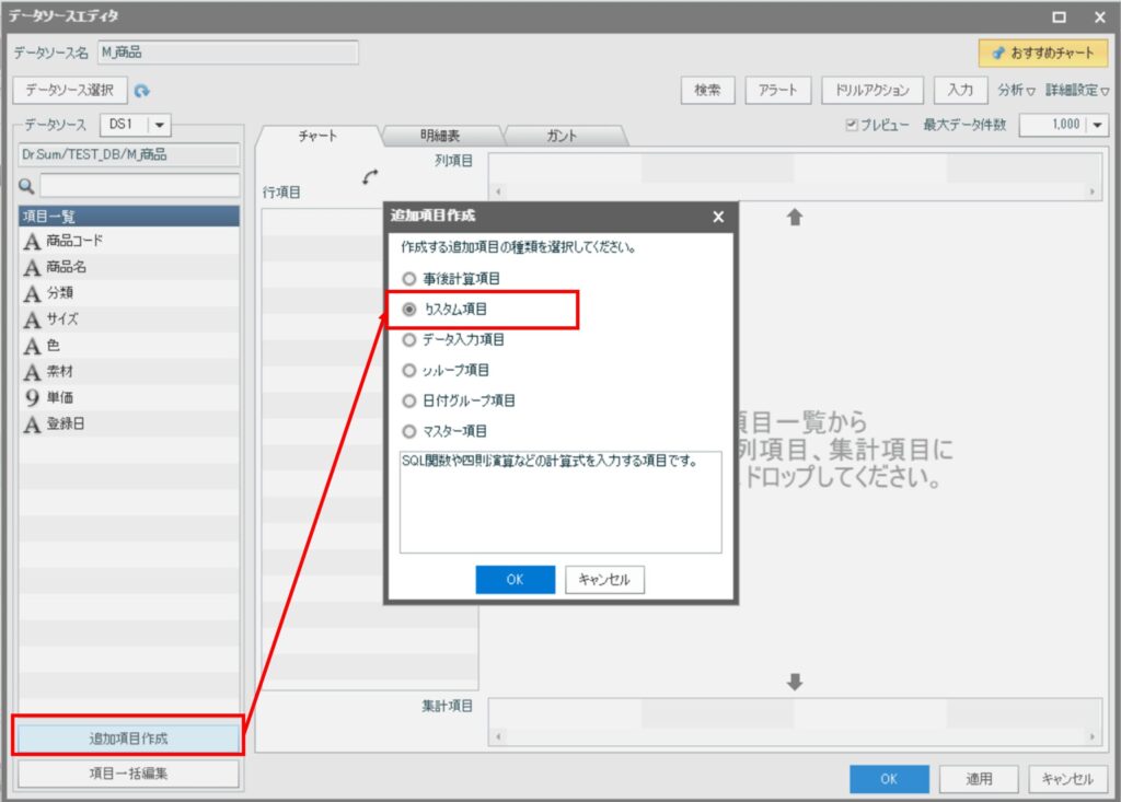 カスタム項目は、データソースエディタの左下にある「追加項目作成」から「カスタム項目」を選択して追加します。