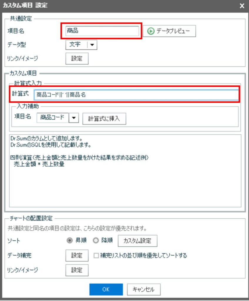 カスタム項目設定画面の項目名に名前を、中央の計算式に商品コードと商品名を結合する式を入力します。