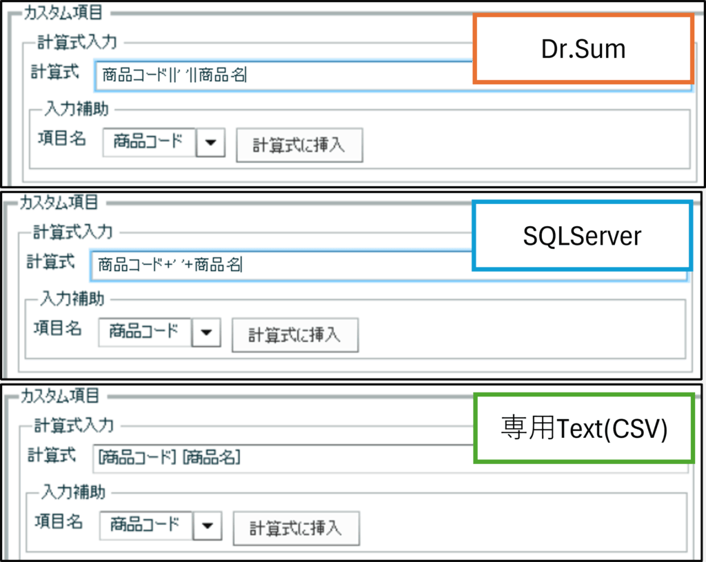 上の例ではDr.Sumを使用しており、文字列はパイプ(縦棒)2本の「||」で結合しています。また、半角スペースをシングルクォーテーション「’」で囲っています。
