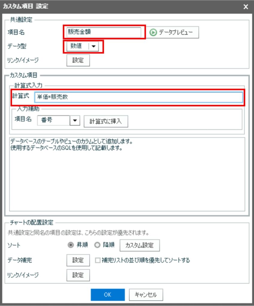 同様にカスタム項目を作成し、「単価」と「販売数」を掛け合わせて「販売金額」も作ってみます。