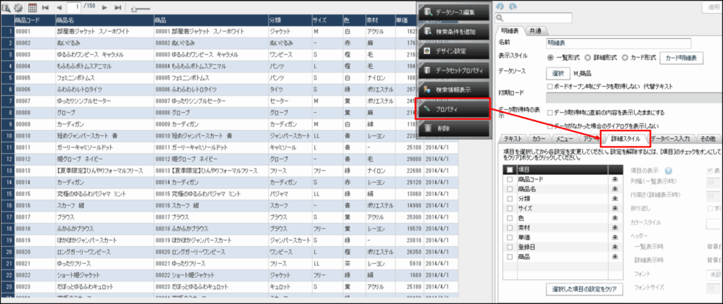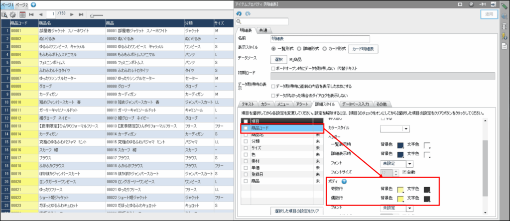 下図では、「商品コード」のボディの背景色を黄色に変更してみました。