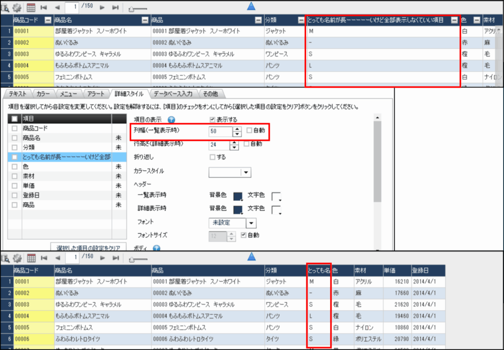 一部の項目名が長すぎて見づらくなっていましたが、列幅を指定することで画面に全項目が収まり見やすくなりました。