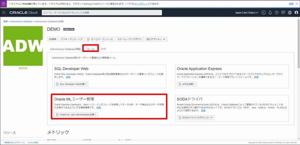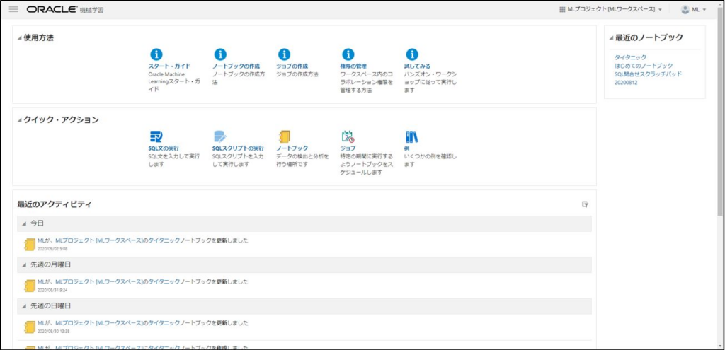 クライアントPC の SQL Developer からでも機械学習のストアドは実行できますが、せっかくなので ADW ならではの「Oracle Machine Learningノートブック」を使っていきます。