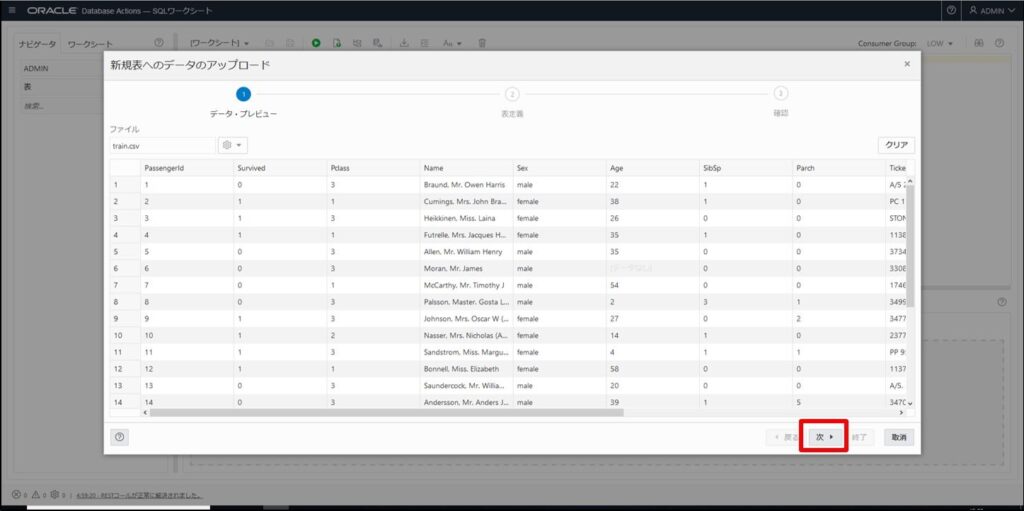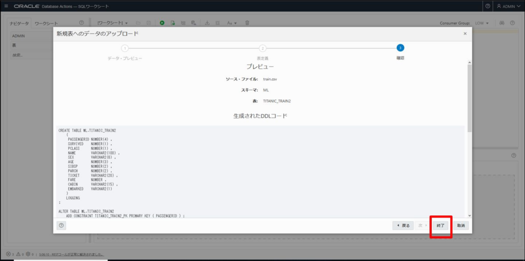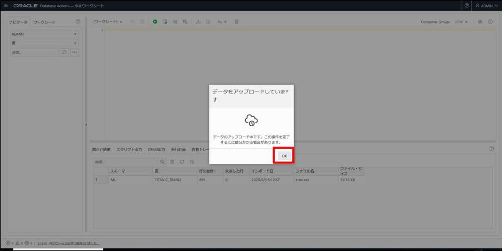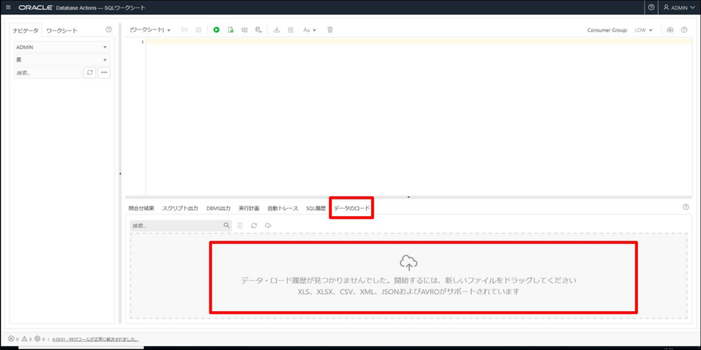 こちらの方法では CSV を画面にドラッグするだけでロードできます。ただし、「SQL Developer Web」には管理者権限のある Oracle ユーザでなければ入れないという注意点があります。