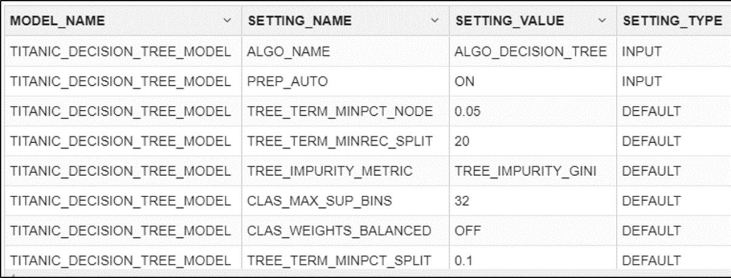 SETTINGS_TABLE_NAME => 'TITANIC_DECISION_TREE_SETTINGS');
