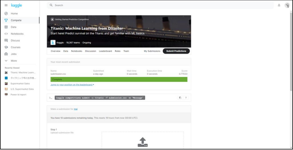 結果をKaggleのSubmit Predictionsから投稿してみます。