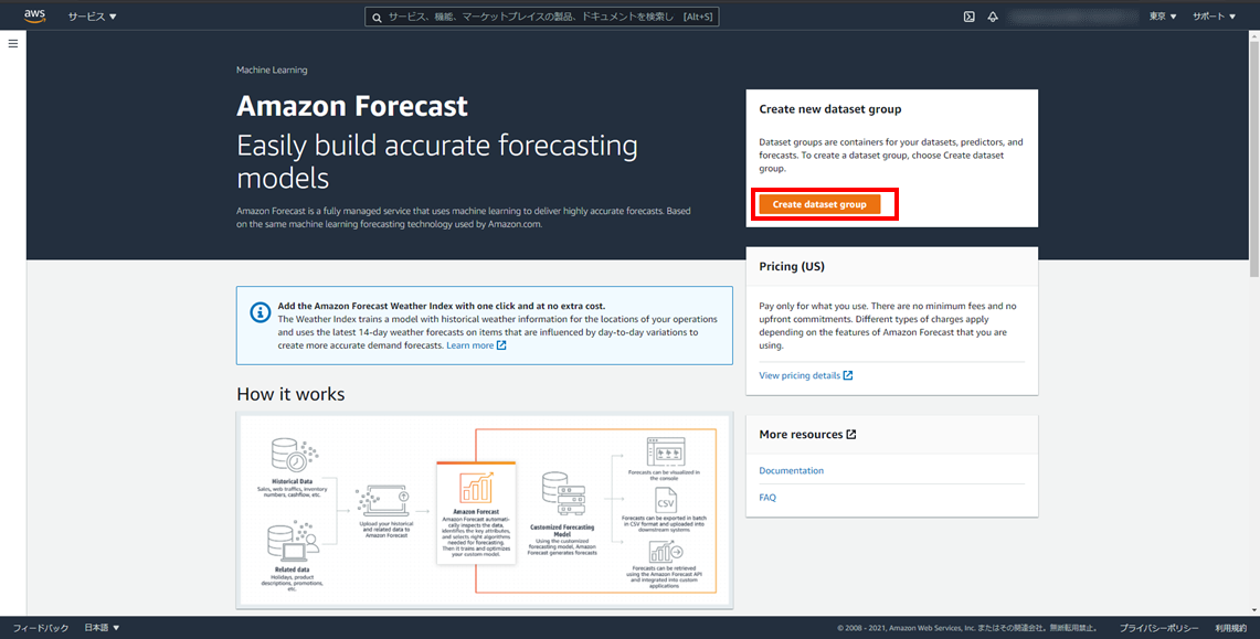 Amazon Forecastは、Amazon.comの機械学習予測技術に基づいて、統計アルゴリズムと機械学習アルゴリズムを使用し、高い精度の時系列予測を提供する完全マネージド型サービスです。