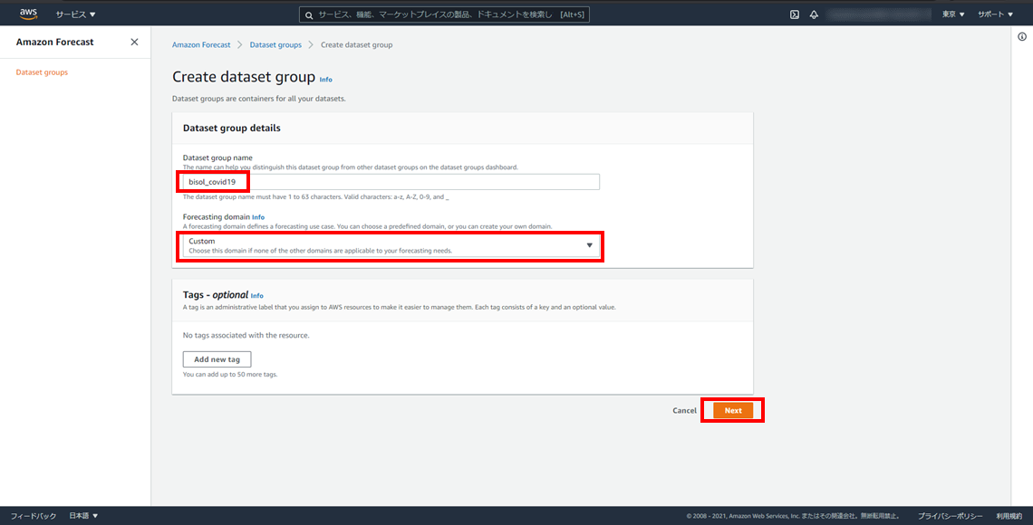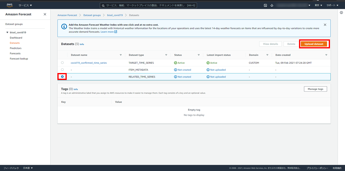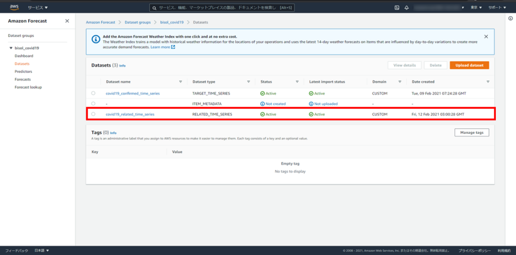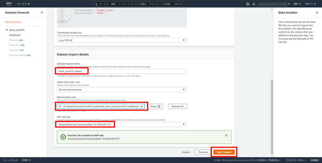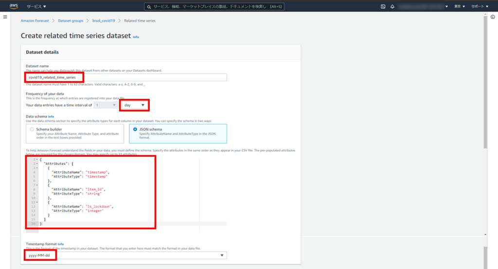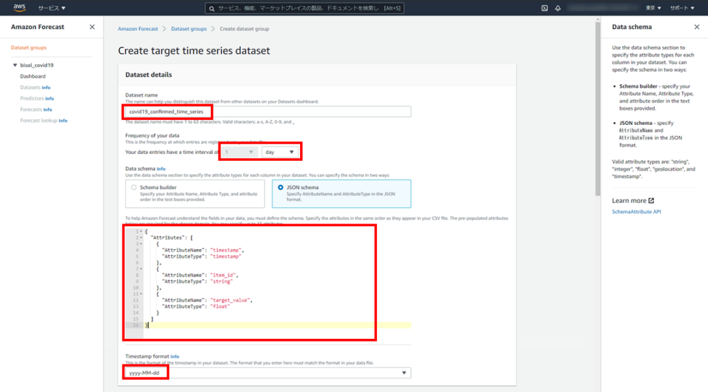 データセットグループの作成とデータセットの作成を行い、予測を行うためのデータセット群の準備をします。