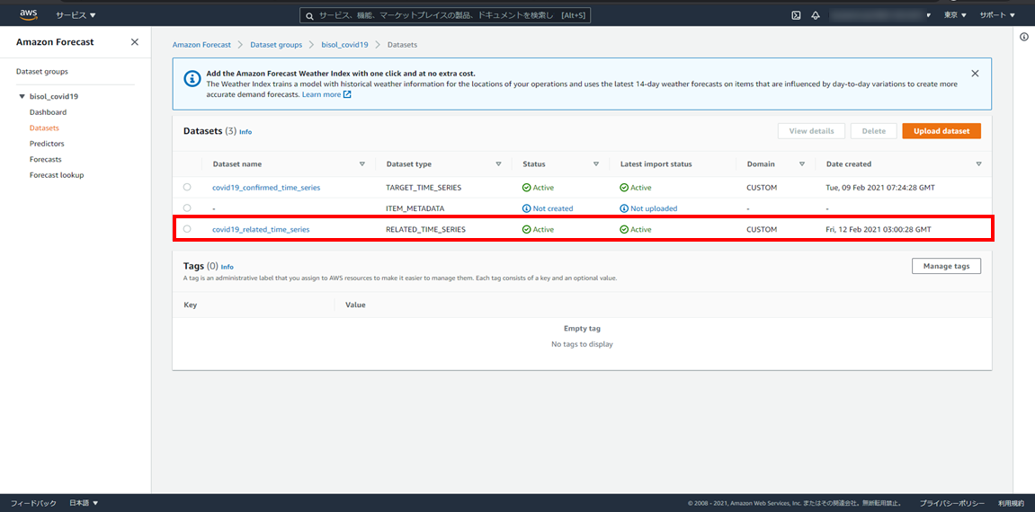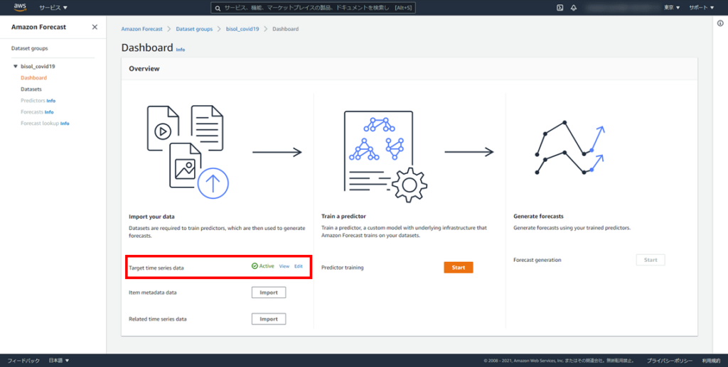 データセットグループのダッシュボードページが表示され、ターゲット時系列データのインポートジョブのステータスが表示されます。