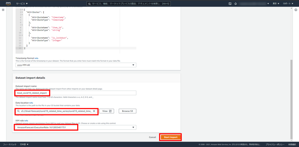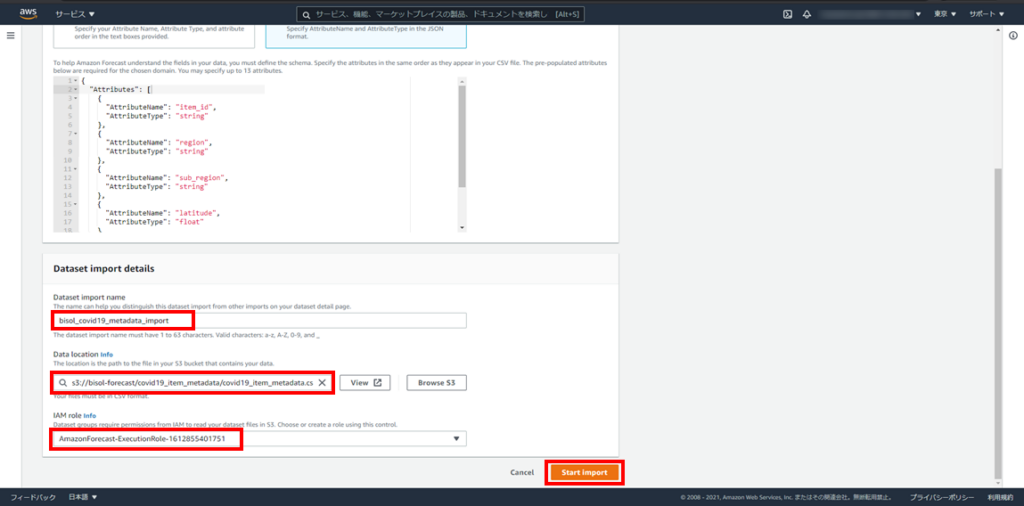 Amazon S3に格納した各CSVファイルのデータをスキーマ経由でAmazon Forecastに読み込みます。