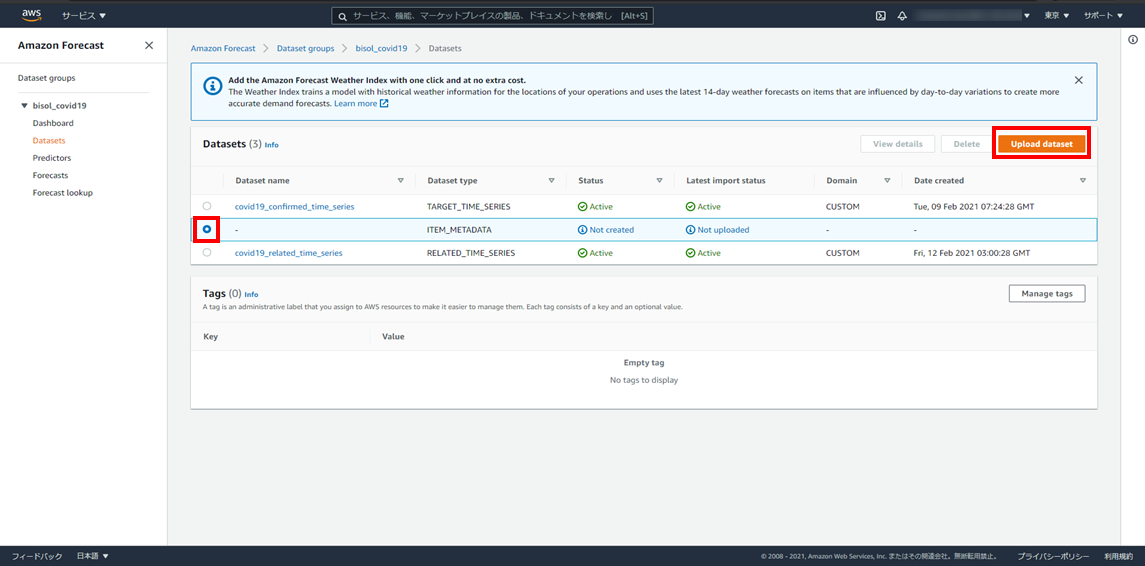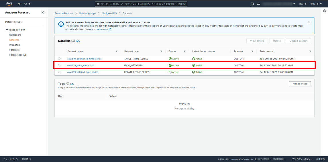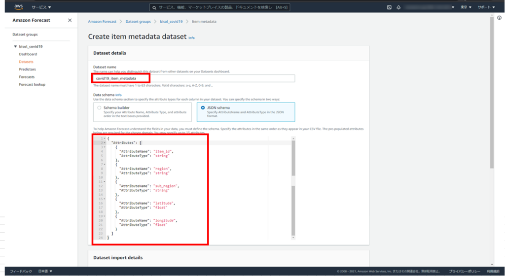 - データセットのインポートジョブ名:bisol_covid19_metadata_import
