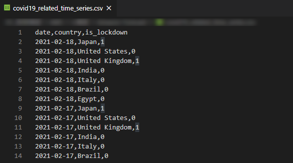 予測したいデータに関連する補完的な時系列データとして、各国のロックダウンや緊急事態宣言の有無を示す時系列データを用意しました。