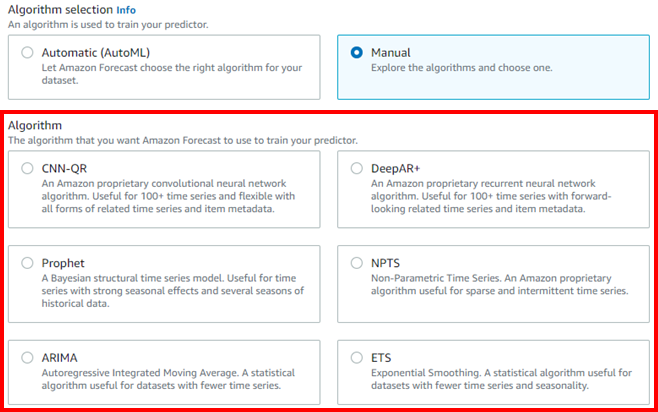 Amazon Forecastには、6種類の事前定義済のアルゴリズムが用意されています。