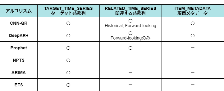 例えば、ITEM_METADATA(項目メタデータ)は、CNN-QRとDeepAR+アルゴリズムでしか考慮されません。