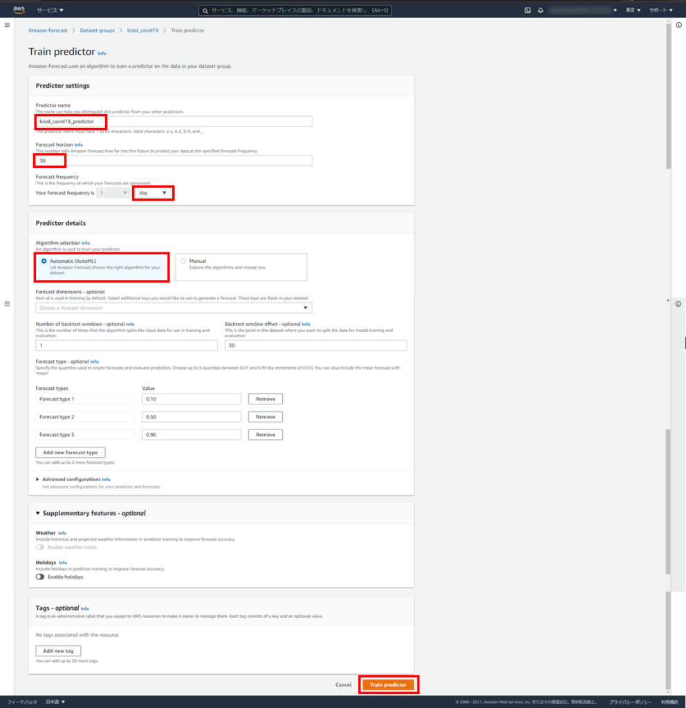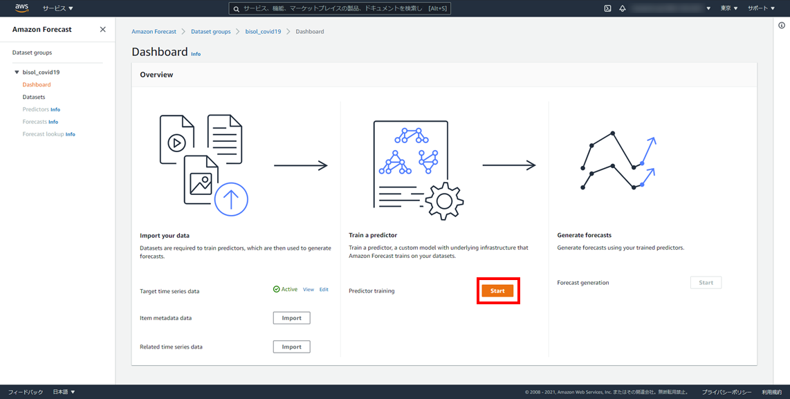 それでは、Amazon Forecastで予測子(学習済みモデル)を作成していきます。