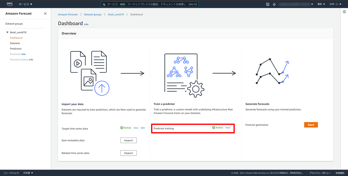 データセットグループのダッシュボードページが表示され、予測子のトレーニングが完了するとステータスが「Active」に変わります。