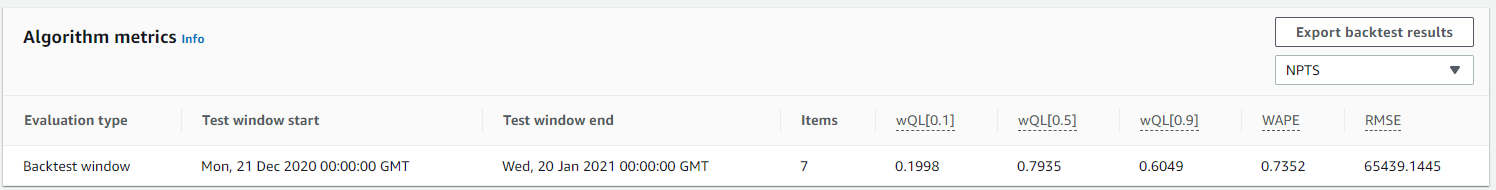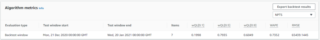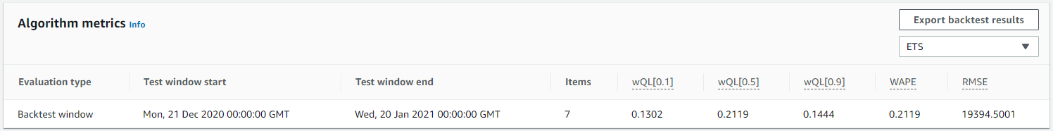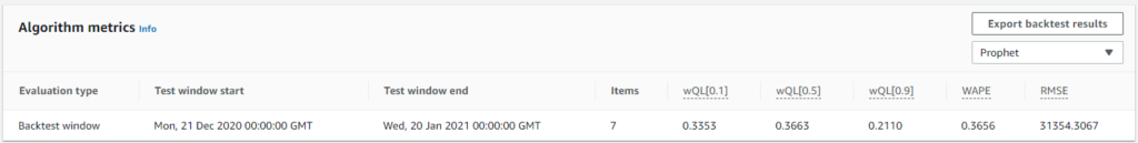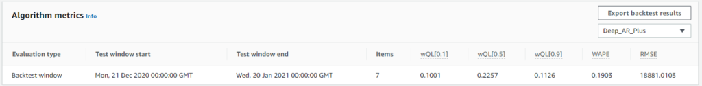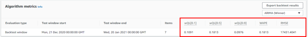 AutoMLを利用したか否か、AutoMLの場合は最終的に選ばれたアルゴリズムやモデルの評価指標(wQL、WAPE、RMSE)などの情報が表示されています。