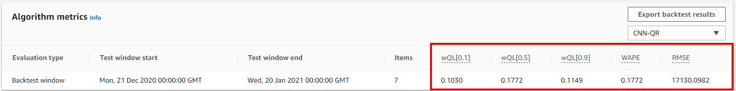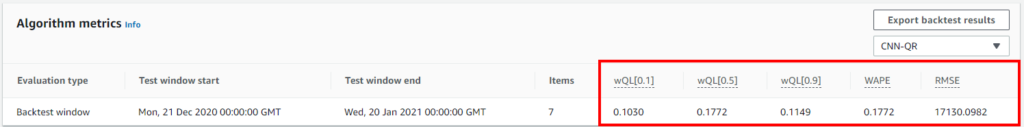 RMSE、WAPE、wQLのメトリクスは誤差や損失の数値なので、値が小さいほど優れたモデルであることを示します。