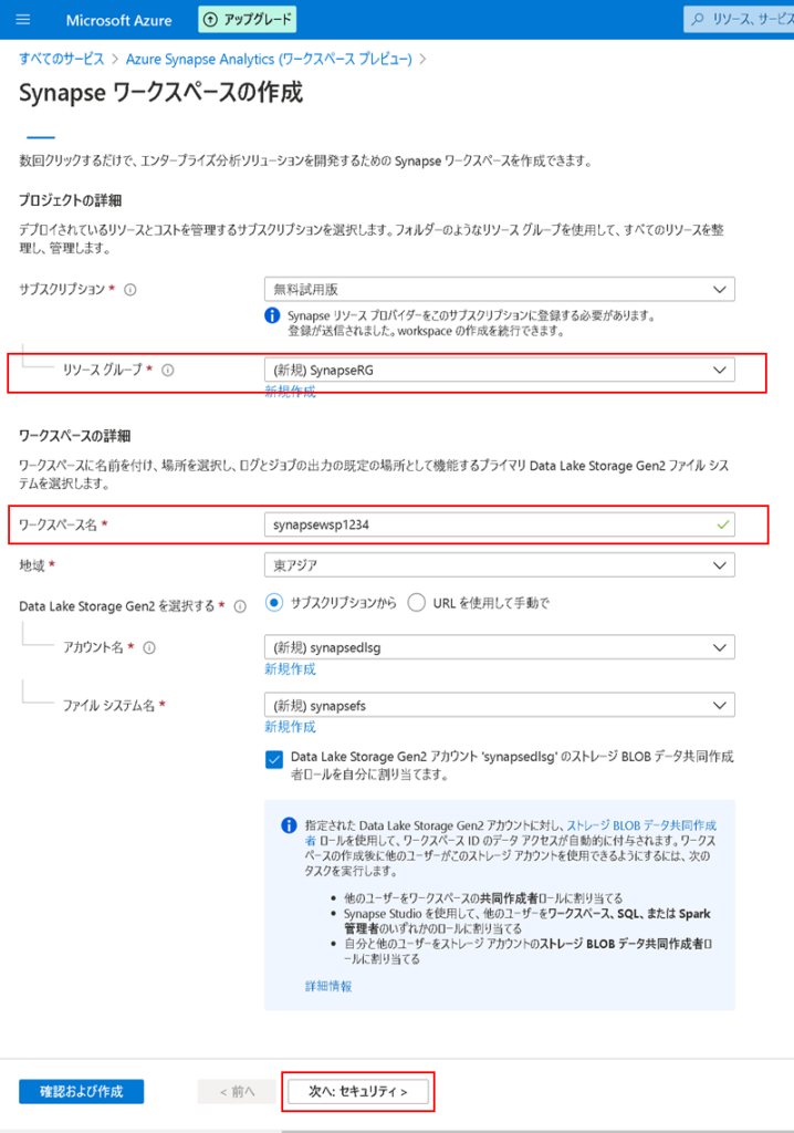 「すべてのサービス」から「Azure Synapse Analytics(ワークスペースプレビュー)」を選択し、「Synapseワークスペースの作成」ページを表示します。