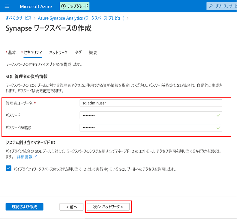 「SQL管理者の資格情報」として、管理者ユーザ名とパスワードを入力し、「次へ:ネットワーク」をクリックします。