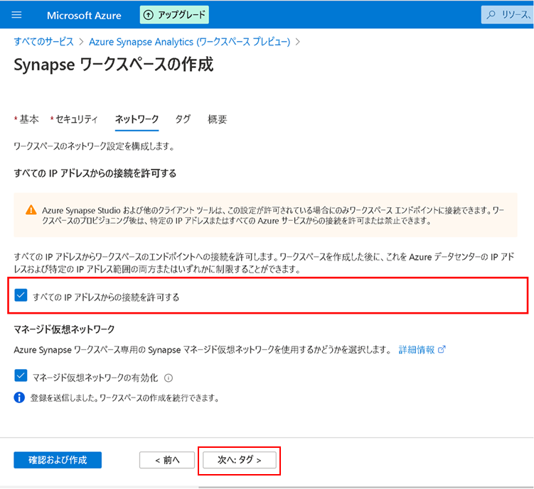 今回は「すべてのIPアドレスからの接続を許可する」を選択し、「次へ:タグ」をクリックします。