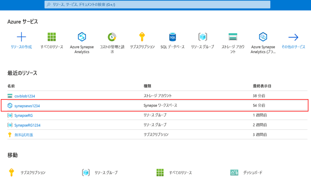 ホームの「最近のリソース」から先ほど作成した「Synapseワークスペース」をクリックします。
