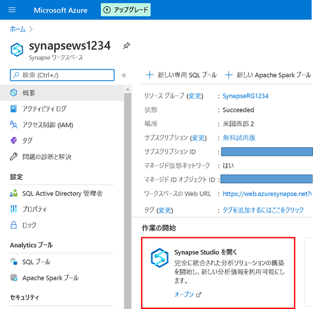 Synapseワークスペースページの「Synapse Studioを開く」をクリックします。