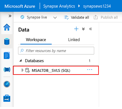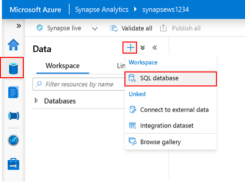 Synapse Studioから、「Data」→「+」→「SQL database」をクリックします。