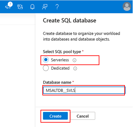 ページ右側に「Create SQL database」が表示されるので、「Select SQL pool type」の「Serverless」を選択し、「Database name」を設定して「Create」ボタンをクリックします。