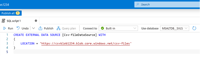 まずはCSVファイルが格納されているBLOBストレージを認識するため、使い慣れたTransact-SQLで、「create extarnal data source」を使い外部データソースを作成します。