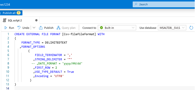 次にCSVファイルのフォーマットを「create extarnal file format」を使い登録します。