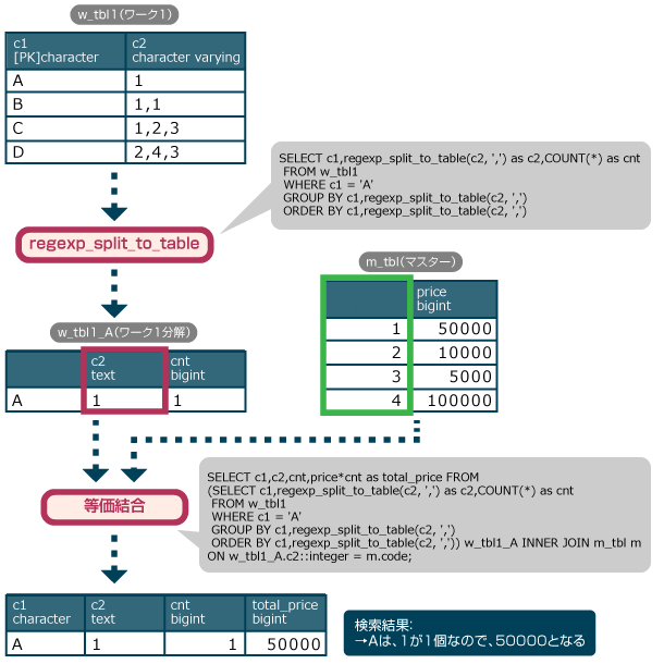 →解決方法として、カンマ区切りのデータを、regexp_split_to_table関数を使用し、以下のようにテーブルを分割してから、マスター表と結合しました。