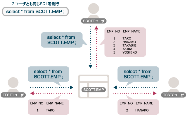 各ユーザでSCOTT.EMPに対して条件なしの同じselect文を発行し、返される結果を確認します。